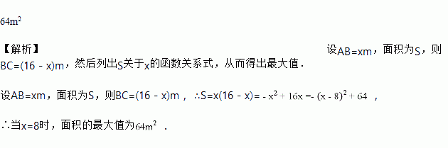 如图,假设篱笆(虚线部分)的长度16m,则所围成矩形ABCD的最大面积是____________________