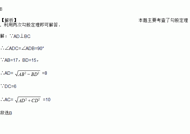 如图,在△ABC中,AD⊥BC与D,AB=17,BD=15,DC=6,则AC的长为( ).