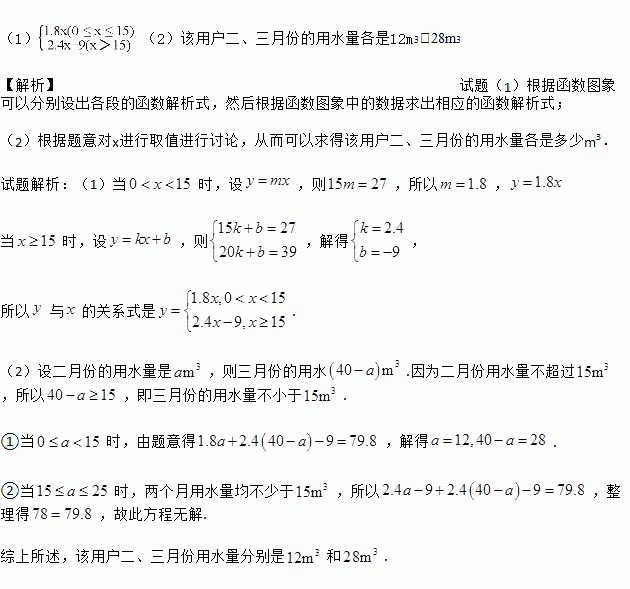 (2)若某用户二、三月份共用水40m3(二月份用水量不超过25m3),缴纳水费79.8元,则该用户二、三月份的用水量各是多少m3?