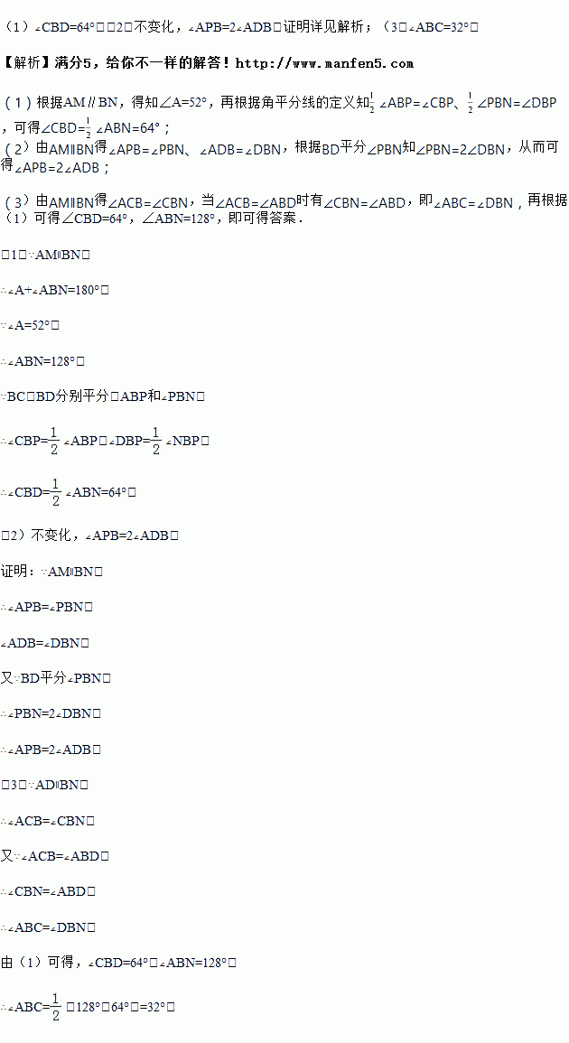 如图,已知AM∥BN,∠A=52°,点P是射线AM上的动点(与点A不重合),BC、BD分别平分∠ABP和∠PBN,分别交射线AM于点C,D.