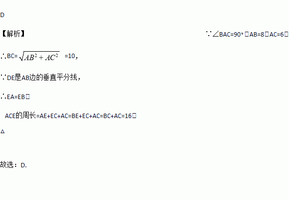 在Rt△ABC,∠BAC=90°,AB=8,AC=6,DE是AB边的垂直平分线,垂足为D,交边BC于点E,连结AE,则△ACE的周长是( )