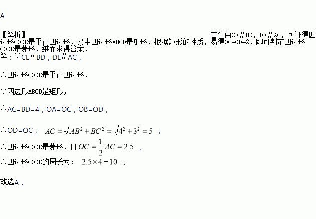 如图所示,矩形ABCD的对角线AC、BD相交于点O,CE∥BD,DE∥AC,若AB=4,BC=3,则四边形CODE的周长是( )