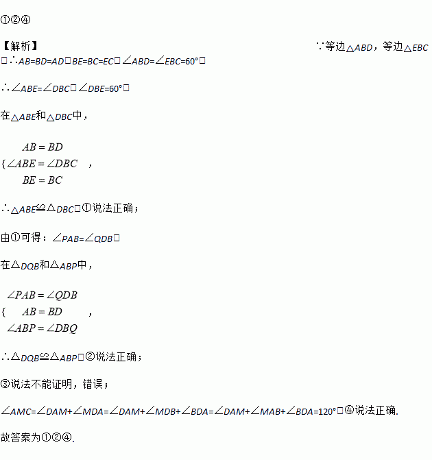 如图,点A,B,C在同一直线上,在这条直线同侧作等边△ABD和等边△BCE,连接AE和CD,交点为M,AE交BD于点P,CD交BE于点Q,连接PQ、BM, 有4个结论:①△ABE≌△DBC,②△DQB≌△ABP,③∠EAC=30°,④∠AMC=120°,请将所有正确结论的序号填在横线上______.