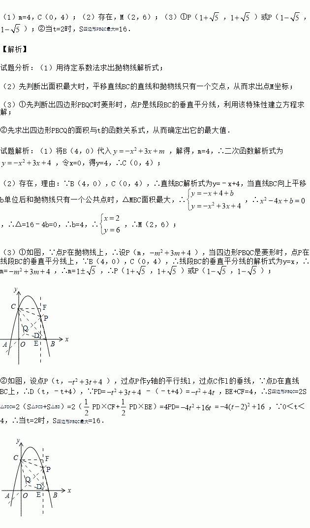 ②点P的横坐标为t(0<t<4),当t为何值时,四边形PBQC的面积最大,请说明理由.