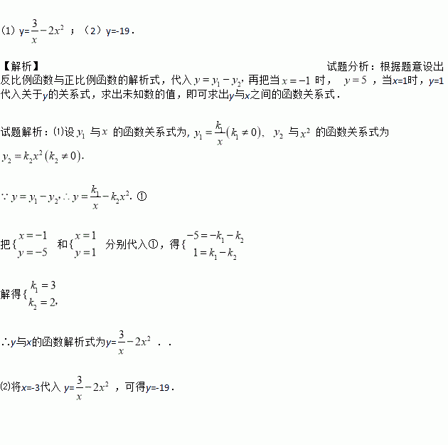 (1) y=;(2)y=-19. 【解析】试题分析:根据题意设出反比例函数与正比例函数的解析式,代入再把当时, ,当x=1时,y=1代入关于y的关系式,求出未知数的值,即可求出y与x之间的函数关系式. 试题解析:⑴设与的函数关系式为, 与的函数关系式为 ① 把和分别代入①,得 解得 ∴y与x的函数解析式为y=.. ⑵将x=-3代入 y=,可得y=-19. ...
