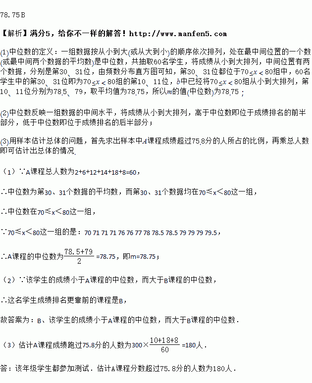 (3)假设该年级学生都参加此次测试,估计A课程成绩超过75.8分的人数.