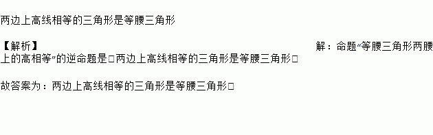 两边上高线相等的三角形是等腰三角形 【解析】【解析】 命题“等腰三角形两腰上的高相等”的逆命题是:两边上高线相等的三角形是等腰三角形. 故答案为:两边上高线相等的三角形是等腰三角形.