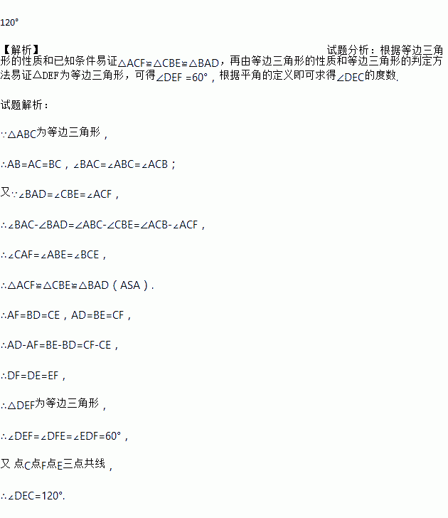 如图,△ABC为等边三角形,∠BAD=∠ACF=∠CBE,求∠DEC的度数。