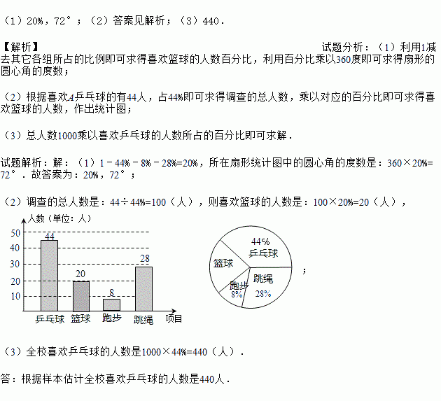(3)已知该校有1000名学生,根据样本估计全校喜欢乒乓球的人数是多少?