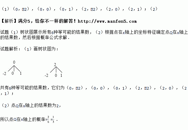 有甲、乙两个不透明的布袋,甲袋中有2个完全相同的小球,分别标有数字0和-2;乙袋中有3个完全相同的小球,分别标有数字-2,0和1,小明从甲袋中随机取出1个小球,记录标有的数字为x,再从乙袋中随机取出1个小球,记录标有的数字为y,这样确定了点Q的坐标(x,y).