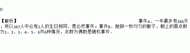有两个事件,事件A:367人中至少有2人生日相同;事件B:抛掷一枚均匀的骰子,朝上的面点数为偶数.下列说法正确的是( )