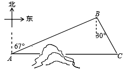 如图,C地在A地的正东方向,因有大山阻隔,由A地到C地需绕行B地,现计划开凿隧道使A、C两地直线贯通,经测量得:B地在A地的北偏东67°方向,距离A地280km,C地在B地南偏东的30°方向.
