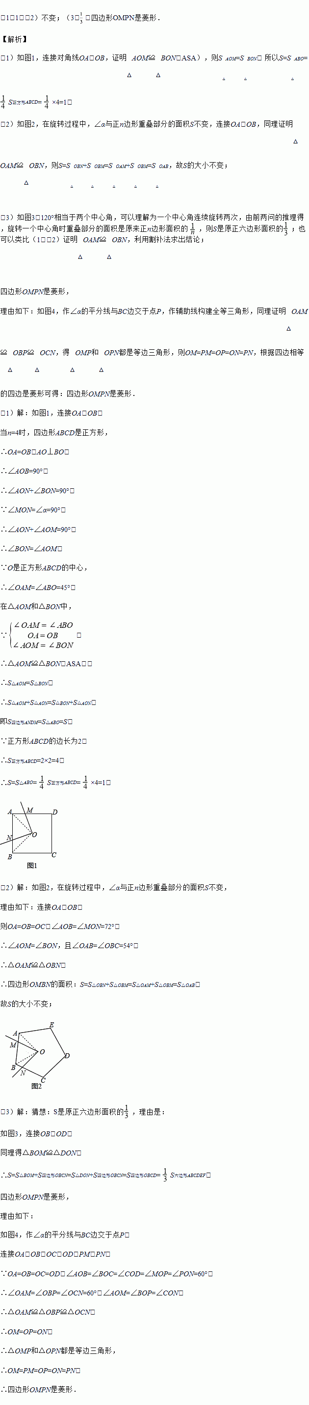 £¨3£©µ±n=6£¬¡Ï¦Á=120¡ãʱ£¬Èçͼ£¨3£©£¬Çë²ÂÏëSÊÇÔÕýÁù±ßÐÎÃæ»ýµÄ¼¸·ÖÖ®¼¸£¨²»±ØËµÃ÷ÀíÓÉ£©£®Èô¡Ï¦ÁµÄƽ·ÖÏßÓëBC±ß½»ÓÚµãP£¬ÅжÏËıßÐÎOMPNµÄÐÎ×´£¬²¢ËµÃ÷ÀíÓÉ£®