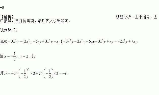 先化简,再求值:3x2y-[2x2y-3(2xy-x2y)-xy],其中x=-,y=2.
