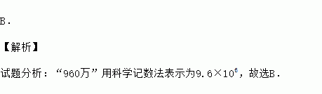 中国幅员辽阔,陆地面积约为960万平方公里,“960万”用科学记数法表示为( )