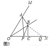 (3)如图3,∠MON=60°,连接AP,设=k,当P和Q两点都在射线ON上移动时,k是否存在最小值?若存在,请直接写出k的最小值;若不存在,请说明理由.