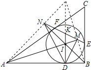 分析 易知I,D,E,B四点共圆.作出∠AID=∠MED,于是I,D,E,M四点共圆.从而I,D,B,E,M五点共圆,∠IMB=∠IEB=90°,即AM⊥BM.同理,I,D,A,N,F五点共圆,且BN⊥AN.设直线AN,BM交于点G,则易知点I为△GAB的垂心.又ID⊥AB,得出G,I,D共线.由G,N,D,B四点共圆,知∠ADN=∠G.同理∠BDM=∠G.得出DK平分∠MDN,从而$\frac{DM}{DN}=\frac{KM}{KN}$,由I,D,E,M;I,D,N,F分别共圆,由割线定理得出KM•KE=KI•KD=KF•KN,得出$\frac{KM}{KN}=\frac{KF}{KE}$,即可得出结论.