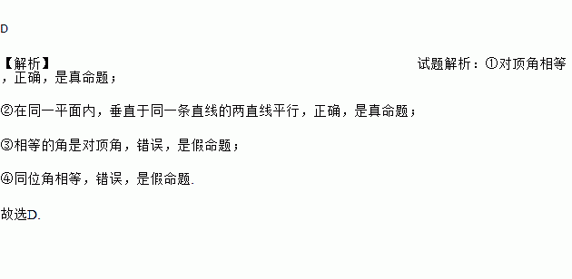 命题:①对顶角相等;②在同一平面内,垂直于同一条直线的两直线平行;③相等的角是对顶角;④内错角相等.其中假命题有( )