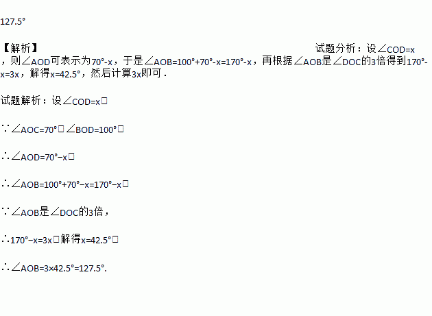 如图,已知∠AOC=70°,∠BOD=100°,∠AOB是∠DOC的3倍,求∠AOB的度数.
