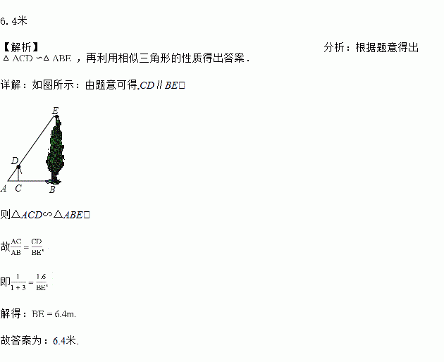 如图,身高1.6米的某学生想测量一棵大树的高度,她沿着树影BA由B向A走去,当走到C点时,她的影子顶端正好与树的影子重合,测得BC=3米,CA=1米,则树的高度为_________。