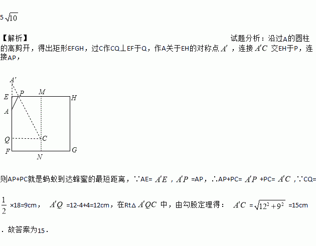 如图,圆柱形玻璃杯,高为12cm,底面周长为18cm,在杯内离杯底3cm的点C处有一滴蜂蜜,此时一只蚂蚁正好在杯外壁,离杯上沿4cm与蜂蜜相对的点A处,则蚂蚁到达蜂蜜的最短距离为__cm.
