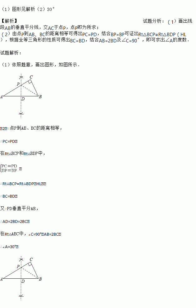 (1)用圆规和直尺在AC上作点P,使点P到A、B的距离相等.(保留作图痕迹,不写作法和证明)