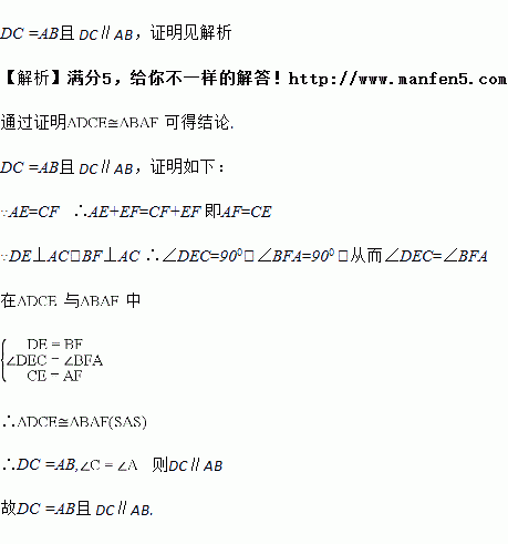 如图,DE⊥AC,BF⊥AC,E,F是垂足,DE=BF,AE=CF.请写出DC与AB之间的关系,并证明你的结论.
