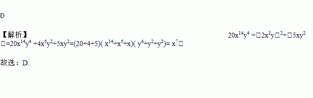 D 【解析】20x14y4 ÷(2x3y)2÷(5xy2)=20x14y4 ÷4x6y2÷5xy2=(20÷4÷5)( x14÷x6÷x)( y4÷y2÷y2)= x7, 故选:D.