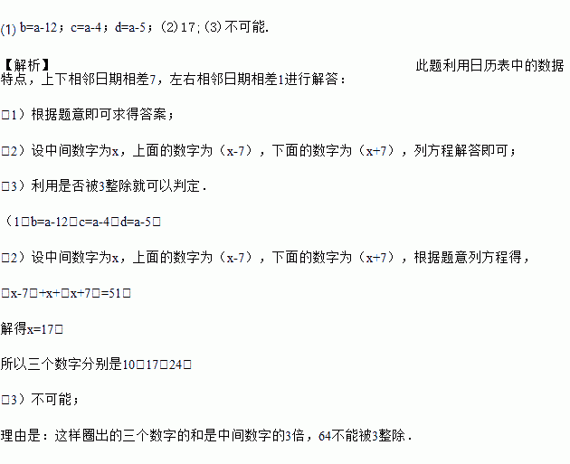 (3)这样圈出的三个数之和可能是64吗?为什么?