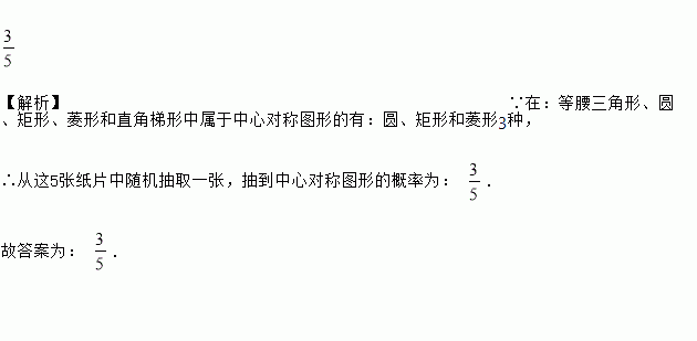 在形状为等腰三角形、圆、矩形、菱形、直角梯形的5张纸片中随机抽取一张,抽到中心对称图形的概率是________.