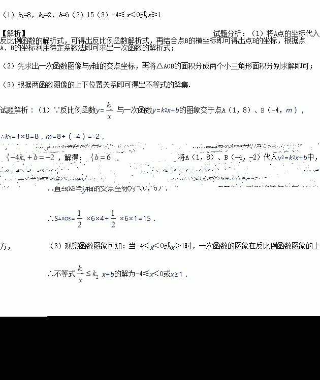 如图,已知反比例函数y1=与一次函数y2=k2x+b的图象交于点A(1,8),B(-4,m)两点.