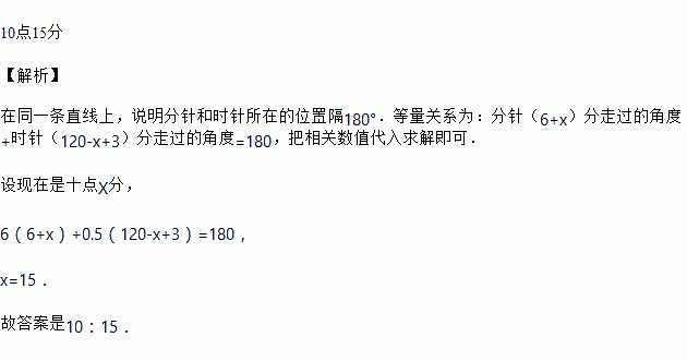 某时刻钟表在10点和11点之间,在这个时刻再过6分钟的分针和这个时刻3分钟前的时针正好方向相反且在同一直线上,那么钟表这个时刻为_________.