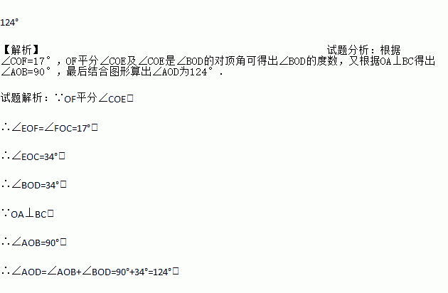 如图,已知直线BC、DE交于O点,OA、OF为射线,OA⊥BC,OF平分∠COE,∠COF=17°.求∠AOD的度数.
