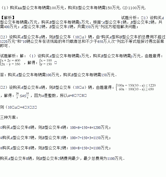 (2)预计在该线路上A型和B型公交车每辆年均载客量分别为60万人次和100万人次.若该公司购买A型和B型公交车的总费用不超过1220万元,且确保这10辆公交车在该线路的年均载客总和不少于650万人次,则该公司有哪几种购车方案?哪种购车方案总费用最少?最少总费用是多少?