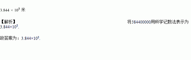 2013年12月15日,我国“玉兔号”月球车顺利抵达月球表面,月球离地球平均距离是384 400 000米,数据384 400 000米用科学记数法表示为____________。