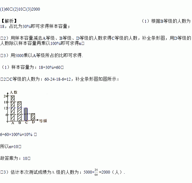 (3)若全市有5000人参加了本次测试,估计本次测试成绩为级的人数为多少?![]()