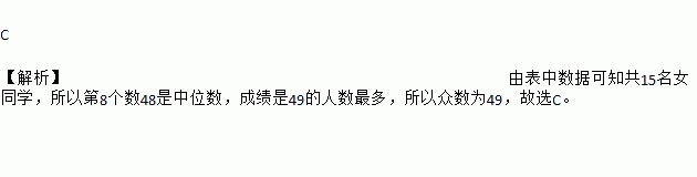 C 【解析】由表中数据可知共15名女同学,所以第8个数48是中位数,成绩是49的人数最多,所以众数为49,故选C。