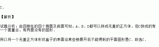 将一个无盖正方体形状盒子的表面沿某些棱剪开,展开后不能得到的平面图形是( )