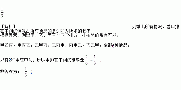 【解析】列举出所有情况,看甲排在中间的情况占所有情况的多少即为所求的概率. 根据题意,列出甲、乙、丙三个同学排成一排拍照的所有可能: 甲乙丙,甲丙乙,乙甲丙,乙丙甲,丙甲乙,丙乙甲,全部6种情况, 只有2种甲在中间,所以甲排在中间的概率是=. 故答案为: ;