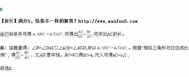 如图,△ABC 中,AD 是中线,BC=8,∠B=∠DAC,则线段 AC 的长为( )