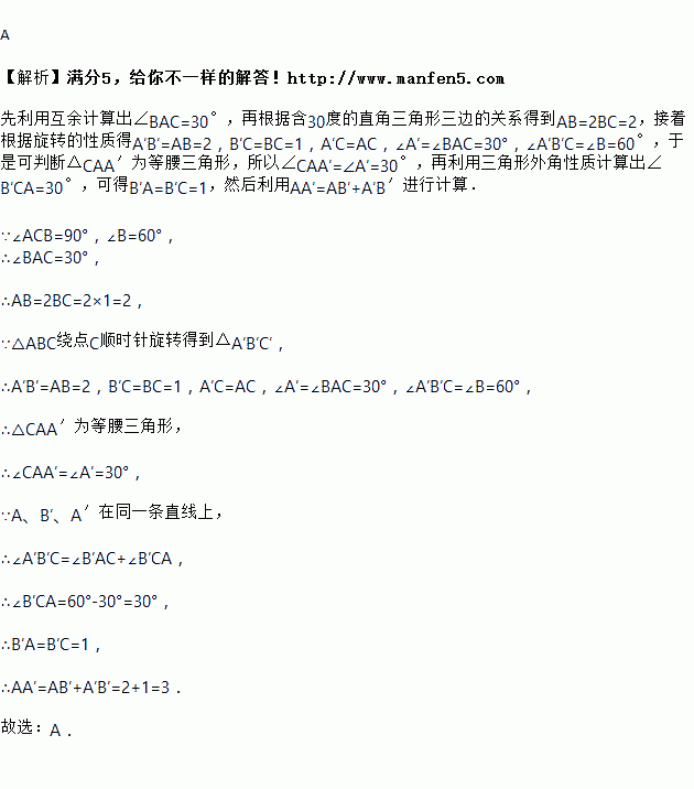 如图,在中,,,,由绕点顺时针旋转得到,其中点与点、点与点是对应点,连接,且、、在同一条直线上,则的长为( )