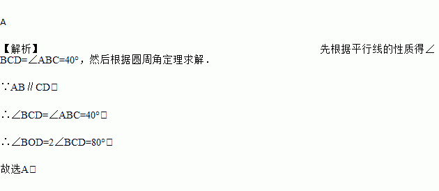 如图,在⊙O中,弦AB∥CD,若∠ABC=40°,则∠BOD=( )