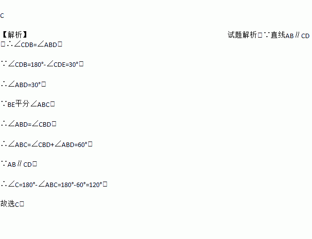 C 【解析】试题解析:∵直线AB∥CD,∴∠CDB=∠ABD, ∵∠CDB=180°-∠CDE=30°, ∴∠ABD=30°, ∵BE平分∠ABC, ∴∠ABD=∠CBD, ∴∠ABC=∠CBD+∠ABD=60°, ∵AB∥CD, ∴∠C=180°-∠ABC=180°-60°=120°. 故选C.
