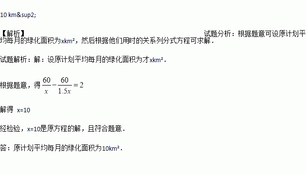 为了美化环境,某地政府计划对辖区内60km2的土地进行绿化,为了尽快完成任务,实际平均每月的绿化面积是原计划的1.5倍,结果提前2个月完成任务,求原计划平均每月的绿化面积.