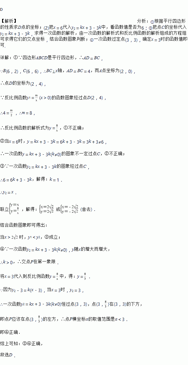 (x>0)的图象过点D,点P是一次函数y2=kx+3﹣3k(k≠0)的图象与该反比例函数的一个公共点,对于下面四个结论: