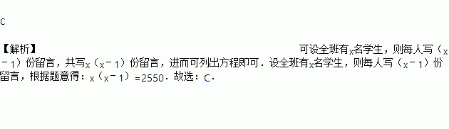 某班学校毕业时,每个同学都要给其他同学写一份毕业留言作为纪念,全班学生共写了2550份留言,如果全班有x名学生,根据题意,列出方程( )