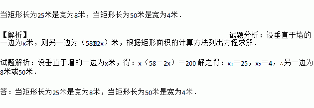利用一面墙(墙的长度不限),另三边用58m长的篱笆围成一个面积为200m2的矩形场地,求矩形的长和宽.