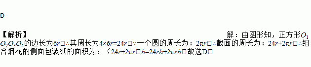 如图是一个组合烟花(图1)的横截面,其中16个圆的半径相同,点O1、O2、O3、O4分布是四个角上的圆的圆心,且四边形O1O2O3O4是正方形。若圆的半径为r,组合烟花的高度为h,则组合烟花侧面包装纸的面积至少需要(接缝面积不计)( )