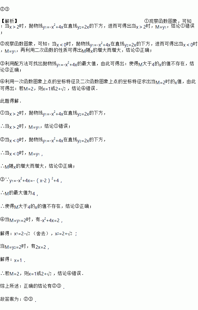 如图,已知抛物线y1=﹣x2+4x和直线y2=2x.我们规定:当x取任意一个值时,x对应的函数值分别为y1和y2,若y1≠y2,取y1和y2中较小值为M;若y1=y2,记M=y1=y2.①当x>2时,M=y2;②当x<0时,M随x的增大而增大;③使得M大于4的x的值不存在;④若M=2,则x=1.上述结论正确的是_____(填写所有正确结论的序号).