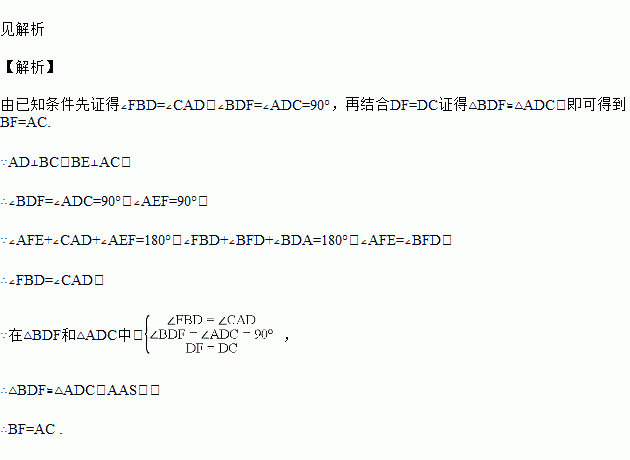 如图,锐角△ABC中,AD⊥BC于D,BE⊥AC于E,AD与BE相交于F,DF=DC.